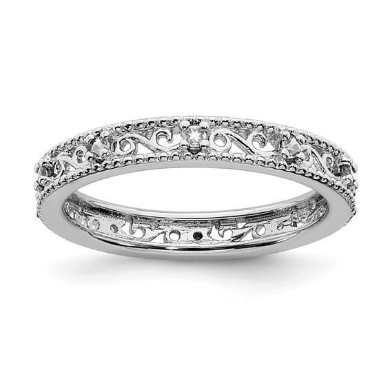 White topaz eternity ring is made of polished sterling silver with rhodium plating. Approximate gemstone total weight: 0.19 carats. Metal weight: 2 grams. Width: 3.0mm. Available in whole finger sizes only, 5-10. Imported. Part of the Stackable Expressions collection.