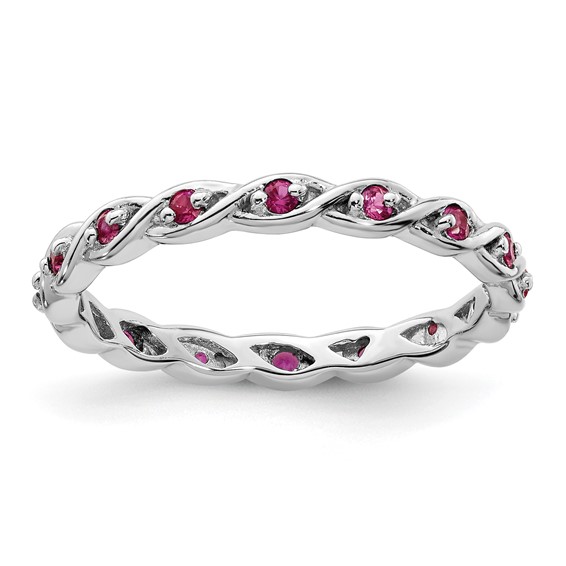 Created ruby eternity ring is made of polished sterling silver with rhodium plating. Approximate gemstone total weight: 0.34 carats. Metal weight: 1.8 grams. Width: 2.5mm. Available in whole finger sizes only, 5-10. Imported. Part of the Stackable Expressions collection.