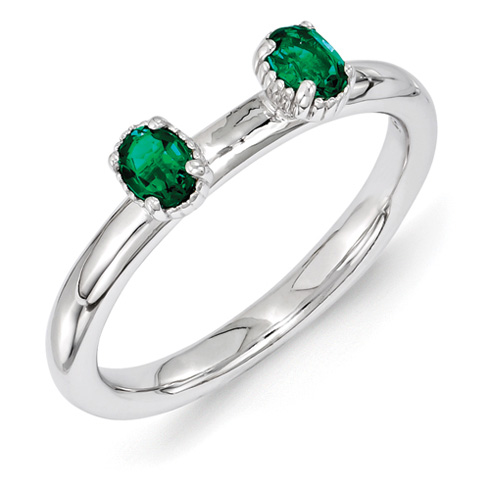 Oval created emerald ring is made of polished sterling silver with rhodium plating. This interlocking ring can only fit next to other interlocking rings or plain bands. Approximate gemstone total weight: 0.34 carats. Metal weight: 3.0 grams. Width: 2.5mm. Available in whole finger sizes only, 5-10. Imported. Part of the Stackable Expressions collection.