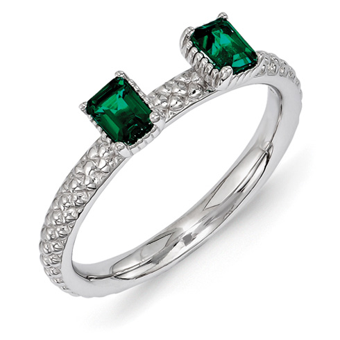 Created emerald ring is made of polished sterling silver with rhodium plating. This interlocking ring can only fit next to other interlocking rings or plain bands. Approximate gemstone total weight: 0.40 carats. Metal weight: 3.0 grams. Width: 2.5mm. Available in whole finger sizes only, 5-10. Imported. Part of the Stackable Expressions collection.