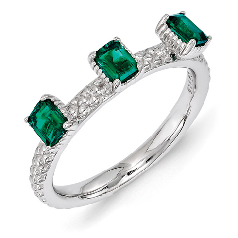 Bold created emerald three stone ring is made of polished sterling silver with rhodium plating. This interlocking ring can only fit next to other interlocking rings or plain bands. Approximate gemstone total weight: 0.60 carats. Metal weight: 3.2 grams. Width: 2.5mm. Available in whole finger sizes only, 5-10. Imported. Part of the Stackable Expressions collection.
