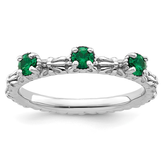 Celtic created emerald three stone ring is made of polished sterling silver with rhodium plating. This interlocking ring can only fit next to other interlocking rings or plain bands. Approximate gemstone total weight: 0.33 carats. Metal weight: 2.75 grams. Width: 2.5mm. Available in whole finger sizes only, 5-10. Imported. Part of the Stackable Expressions collection.
