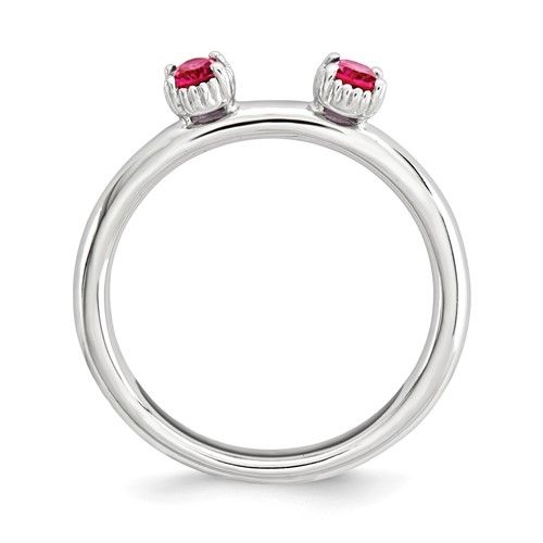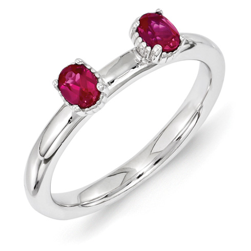 Oval created ruby ring is made of polished sterling silver with rhodium plating. This interlocking ring can only fit next to other interlocking rings or plain bands. Approximate gemstone total weight: 0.50 carats. Metal weight: 3.0 grams. Width: 2.5mm. Available in whole finger sizes only, 5-10. Imported. Part of the Stackable Expressions collection.