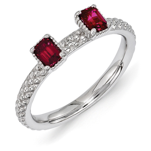 Created ruby two stone ring is made of polished sterling silver with rhodium plating. Beaded finish. Approximate created ruby total weight: 0.56 carats. This interlocking ring can only fit next to other interlocking rings or plain bands. Metal weight: 3.0 grams. Width: 2.5mm. Available in whole finger sizes only, 5-10. Imported. Part of the Stackable Expressions collection.