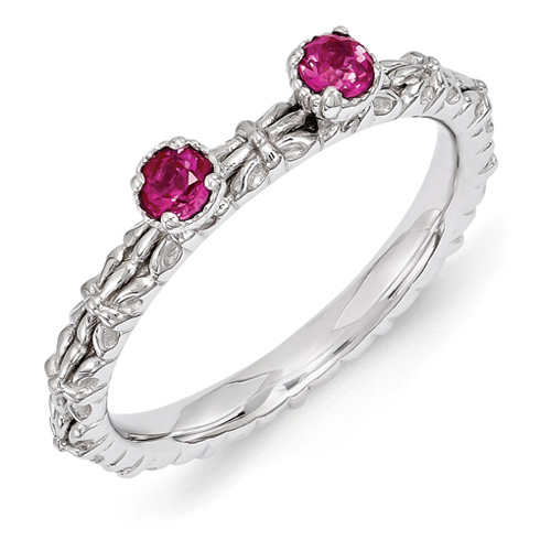 Round created ruby two stone ring is made of polished sterling silver with rhodium plating. Decorative finish. This interlocking ring can only fit next to other interlocking rings or plain bands. Approximate gemstone total weight: 0.32 carats. Metal weight: 2.75 grams. Width: 2.5mm. Available in whole finger sizes only, 5-10. Imported. Part of the Stackable Expressions collection.
