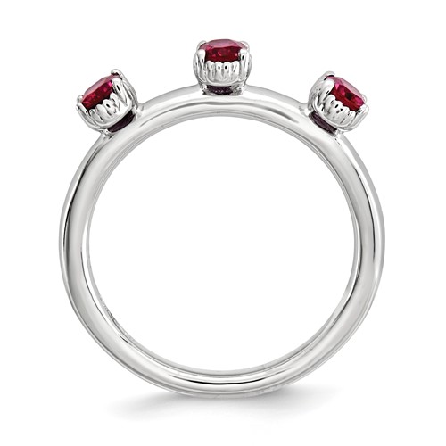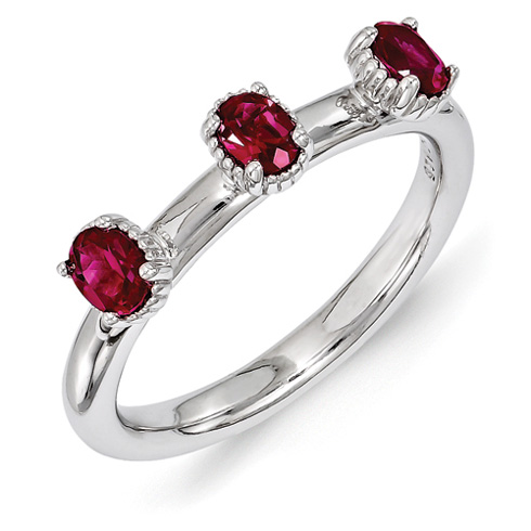 Oval created ruby three stone ring is made of polished sterling silver with rhodium plating. This interlocking ring can only fit next to other interlocking rings or plain bands. Approximate gemstone total weight: 0.75 carats. Metal weight: 3.4 grams. Width: 2.5mm. Available in whole finger sizes only, 5-10. Imported. Part of the Stackable Expressions collection.