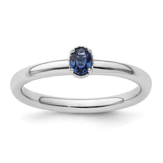 Oval created sapphire ring is made of polished sterling silver with rhodium plating. Approximate gemstone total weight: 0.25 carats. Metal weight: 2.75 grams. Width: 2.5mm. Available in whole finger sizes only, 5-10. Imported. Part of the Stackable Expressions collection.