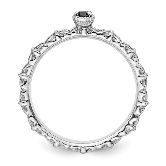Round created sapphire ring is made of polished sterling silver with rhodium plating. Approximate gemstone total weight: 0.16 carats. Metal weight: 2.7 grams. Width: 2.5mm. Available in whole finger sizes only, 5-10. Imported. Part of the Stackable Expressions collection.