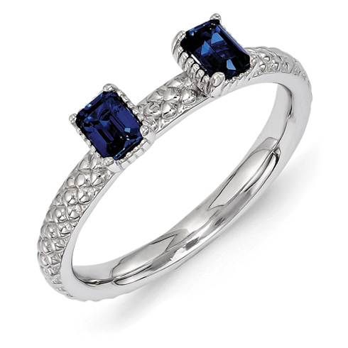 Created sapphire two stone ring is made of polished sterling silver with rhodium plating. Beaded finish. This interlocking ring can only fit next to other interlocking rings or plain bands. Approximate gemstone total weight: 0.56 carats. Metal weight: 3.0 grams. Width: 2.5mm. Available in whole finger sizes only, 5-10. Imported. Part of the Stackable Expressions collection.