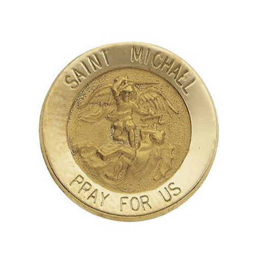 This round St Michael lapel pin is made of polished, solid 14kt yellow gold Inscription: SAINT MICHAEL PRAY FOR US. Item diameter: 15mm. This medal is smaller than a dime, and weighs approximately 1.37 grams.