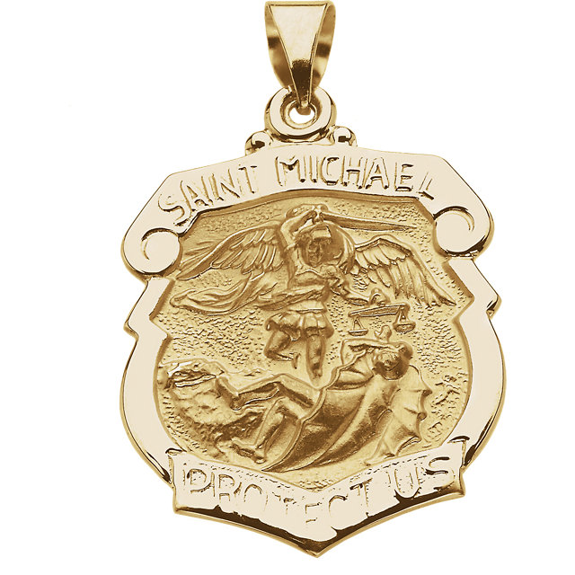 Polished, hollow St Michael shield medal is made of 14kt yellow gold. Item size: 1in x 7/8in. Inscription: SAINT MICHAEL PROTECT US. This medal is the size of a quarter and weighs approximately 1.90 grams. Chain not included. Saint Michael is the patron saint of grocers, mariners, paratroopers, policemen, radiologists, the sick and Germany.