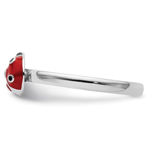 This stackable ring features an enameled red and black ladybug. Ring is made of polished sterling silver with rhodium plating. Metal weight: 3.3 grams. Width: 2.25mm. Available in whole finger sizes only, 5-10. Imported. Part of the Stackable Expressions collection.