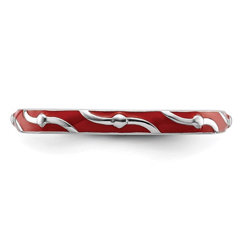 This red enamel stackable ring features a wavy pattern. Ring is made of polished sterling silver with rhodium plating. Metal weight: 2.0 grams. Width: 2.50mm. Available in whole finger sizes only, 5-10. Imported. Part of the Stackable Expressions collection.