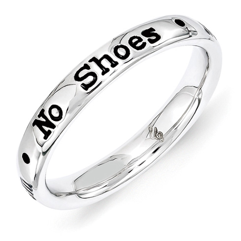 This black enamel stackable ring features the lyrics No Shoes No Shirt No Problem around the ring. Ring is made of polished sterling silver with rhodium plating. Metal weight: 2.9 grams. Width: 3.25mm. Available in whole finger sizes only, 5-10. Imported. Part of the Stackable Expressions collection.