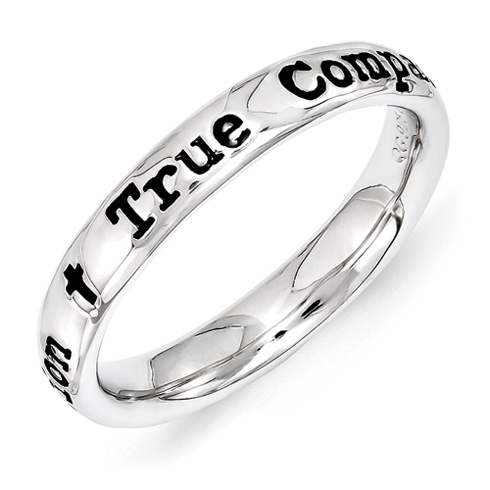 This black enamel stackable ring features the lyrics True Companion around the ring. Ring is made of polished sterling silver with rhodium plating. Metal weight: 2.9 grams. Width: 3.25mm. Available in whole finger sizes only, 5-10. Imported. Part of the Stackable Expressions collection.