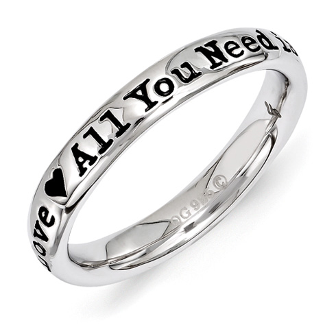 This black enamel stackable ring features the lyrics All You Need is Love around the ring. Ring is made of polished sterling silver with rhodium plating. Metal weight: 2.9 grams. Width: 3.25mm. Imported. Part of the Stackable Expressions collection. Available while supplies last.