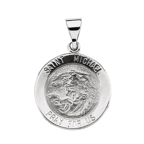 14k white gold polished round St. Michael medal is hollow. Inscription: SAINT MICHAEL PRAY FOR US. This medal is the size of a nickel and weighs approximately 1.94 grams. Item width: 22mm. Chain not included. Saint Michael is the patron saint of grocers, mariners, paratroopers, policemen, radiologists, the sick and Germany.