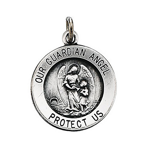 This round guardian angel medal is made of solid 14k white gold. Item size: 18mm, the size of a dime. Inscription reads OUR GUARDIAN ANGEL PROTECT US. Weighs 2.29 grams. Please note: weight is approximate, actual weight may vary. Made in USA.