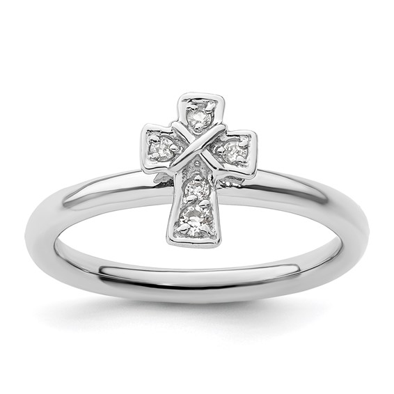 This stackable white topaz cross ring is made of polished sterling silver. .12ct tw genuine round white topaz accents. Metal weight: 3.0 grams. Width: 2.25mm. Available in whole finger sizes only, 5-10. Imported. Part of the Stackable Expressions collection.