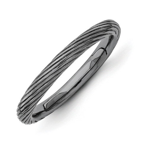 This stackable ring with ridges is made of polished sterling silver with black plating. Metal weight: 2.7 grams. Width: 2.5mm. Available in whole finger sizes only, 5-10. Imported. Part of the Stackable Expressions collection.