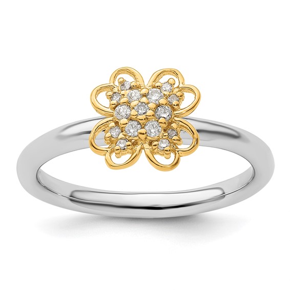 This sterling silver stackable ring features genuine diamonds set within a 14kt rose gold plated flower. .11 ct genuine diamond accents. Metal weight: 3.4 grams. Width: 2.25mm. Available in whole finger sizes only, 5-10. Imported. Part of the Stackable Expressions collection.
