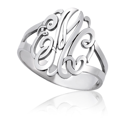 Sterling silver split shank monogram ring features three interlocking capital letters. Please enter the initials in the order you wish them to appear, left to right. The center initial is the largest. Made in the USA. No returns nor exchanges for this custom made item. Finger sizes 6-9, whole and half sizes only.