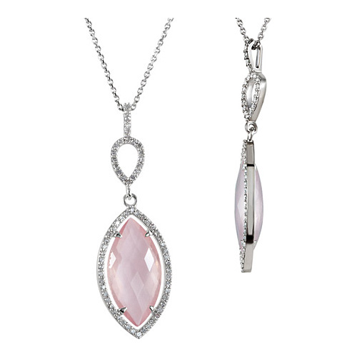Marquise shaped, double sided checkerboard rose quartz dangles from an 18in sterling silver diamond cut cable chain. Spring ring clasp. Quartz dimensions: 20mm x 10mm. This halo style necklace is adorned with 65 x 1mm genuine full cut diamonds. Diamond clarity I2, color G-H. Approximate weight: 3.0 grams.