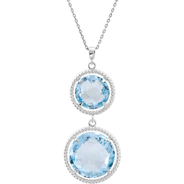 Polished sterling silver necklace features two round, double sided checkerboard sky blue topaz gemstones. 18in sterling silver diamond cut cable chain with spring ring clasp. Sky blue topaz dimensions: 16mm and 12mm. This sterling silver necklace ifeatures rope style texture. Approximate weight: 3.4 grams.