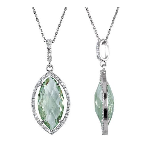 Marquise shaped, double sided checkerboard green quartz dangles from an 18in sterling silver diamond cut cable chain. Spring ring clasp. Quartz dimensions: 20mm x 10mm. This halo style necklace is adorned with 44 x 1mm genuine full cut diamonds and 6 x 1.3mm genuine full cut diamonds. Diamond clarity I2, color G-H. Approximate weight: 2.8 grams.