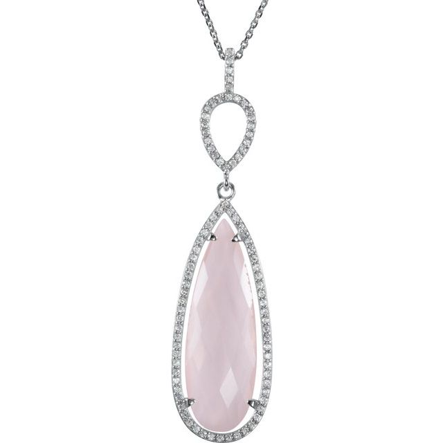 Pear shaped, double sided checkerboard rose quartz dangles from an 18in sterling silver diamond cut cable chain. Spring ring clasp. Quartz dimensions: 30mm x 10mm. This halo style necklace is adorned with 87 x 1mm genuine full cut diamonds. Diamond clarity I2, color G-H. Approximate weight: 3.6 grams.