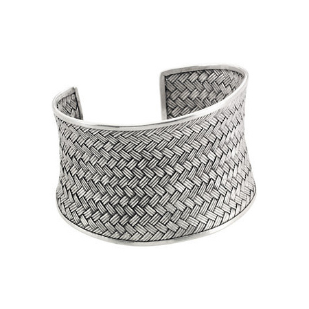 Sterling silver cuff bracelet is adorned with bold woven textures and a smooth polished edge. Width: 2in. One size fits most. Weight: 59.4 grams.