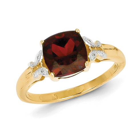 Genuine square garnet is prong set in a 14kt yellow gold ring with diamond accents. Approximate weight: 2.9 grams. Open back. Import.