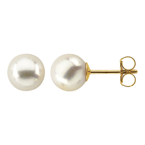 Beautiful set of 4mm white Akoya cultured pearl stud earrings are made with 14kt yellow gold. Pearl details: AA quality, these round half drilled pearls have good shape and good luster. Push on backs.