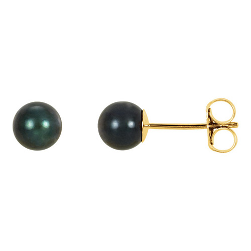 Gorgeous set of 5mm black Akoya cultured pearl stud earrings are made with 14kt yellow gold. Pearl details: AA quality, these round half drilled pearls have good shape and good luster. Push on backs.