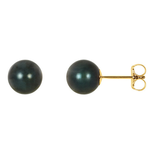 Gorgeous set of 7mm black Akoya cultured pearl stud earrings are made with 14kt yellow gold. Pearl details: AA quality, these round half drilled pearls have good shape and good luster. Push on backs.