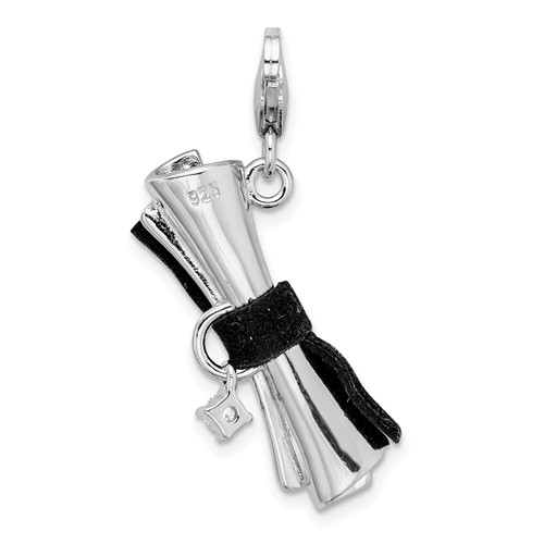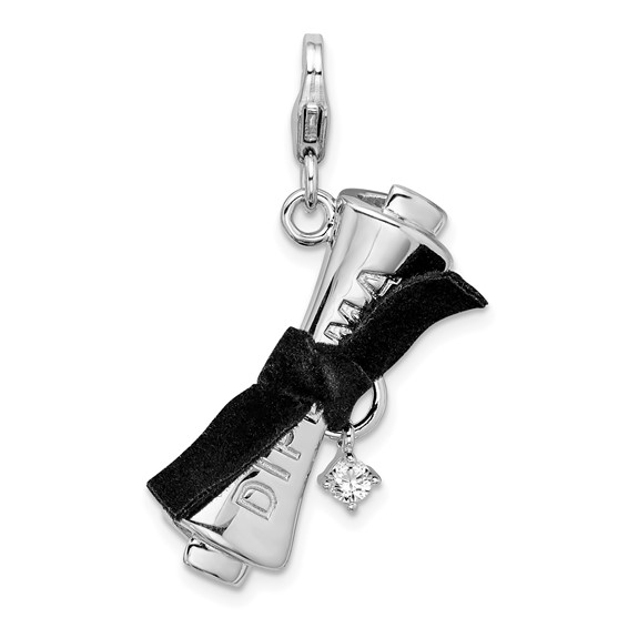 Sterling silver ribboned diploma charm is part of the Amore La Vita collection. Dimensions: 33mm x 29mm. Weight: 5.01 grams. Cubic zirconia. Fabric cord. Fancy lobster clasp.