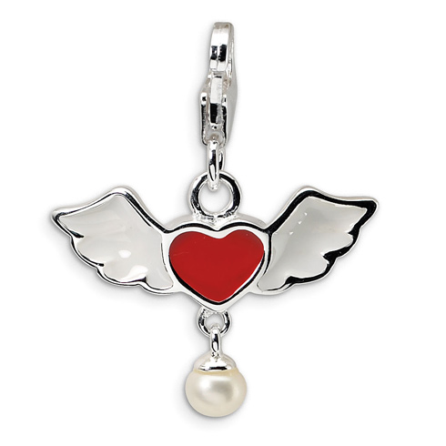 Sterling silver winged red heart charm has a dangling freshwater cultured pearl. Dimensions: 25 MM x 21 MM including the clasp. Weight: 1.85 grams. Reversible. Enamel. Part of the Amore La Vita collection.