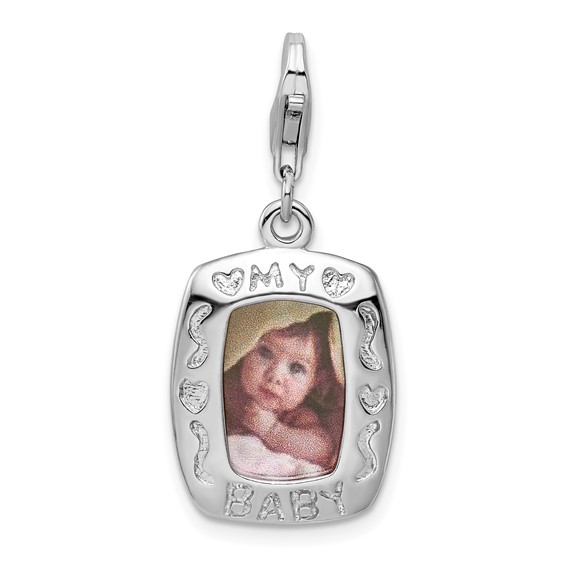 Baby frame charm is made of polished sterling silver. Part of the Amore La Vita collection. Dimensions: 29mm x 13mm including lobster clasp. Weight: 2.28 grams. Import.