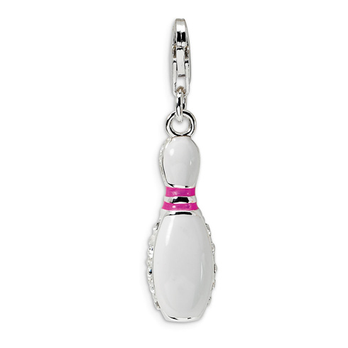 Three dimensional bowling pin charm is made of sterling silver. Dimensions: 31mm x 7mm includes clasp. Weight: 3 grams. Fancy lobster clasp. Swarovski crystals.