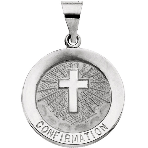 This small hollow round confirmation medal is made of polished 14k white gold. Inscription: CONFIRMATION. Dimensions: 18.25mm x 18.25mm. This item is the size of a dime. Weight: 1.42 grams. Chain not included. Available while supplies last. Made in the USA.