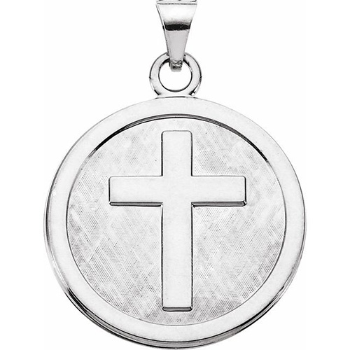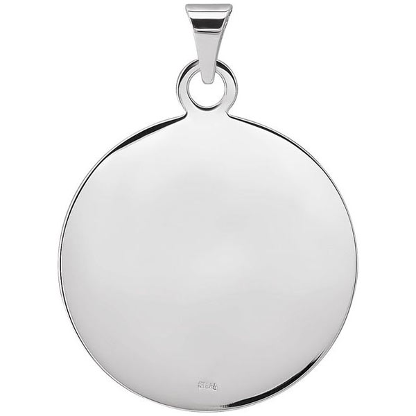 This round confirmation medal is made of solid sterling silver. Dimensions: 23.0mm x 23.0mm. This item is slightly larger than a nickel. Fits up to a 3mm wide chain. Smooth blank back. Weight: 4.19 grams.