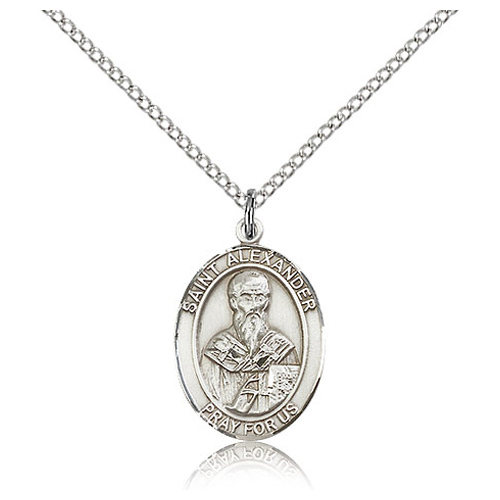 This oval St Alexander medal is made of sterling silver and dangles from a sterling silver 18 inch curb chain with lobster clasp. Dimensions: 3/4in x 1/2in. This item is the size of a penny. Inscription: SAINT ALEXANDER PRAY FOR US. Die struck, hand-engraved medal. Made in USA.
