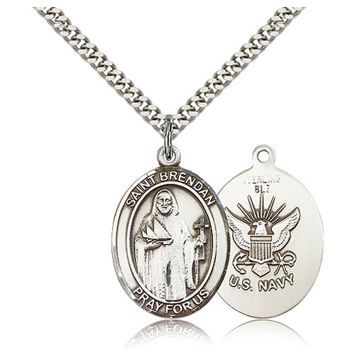 Die struck, hand-engraved Saint Brendan the Navigator medal is made of sterling silver. Dimensions: 1in x 3/4in. 24-inch stainless steel, endless heavy curb chain with silver plating. Inscription: SAINT BRENDAN PRAY FOR US. This item is the size of a quarter. Made in USA.