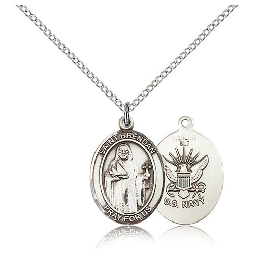 Die struck, hand-engraved 3/4in Saint Brendan the Navigator medal is made of sterling silver. 18-inch sterling silver lite curb chain with lobster clasp. Dimensions: 3/4in x 1/2in. This item is the size of a penny. Made in USA.