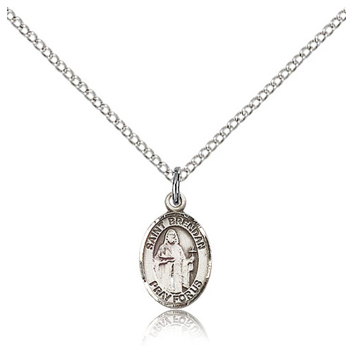 Die struck, hand-engraved Saint Brendan the Navigator charm is made of sterling silver. 18-inch sterling silver lite curb chain with lobster clasp. Plain back. Dimensions: 1/2in x 1/4in. This item is half the height of a quarter. Made in USA.