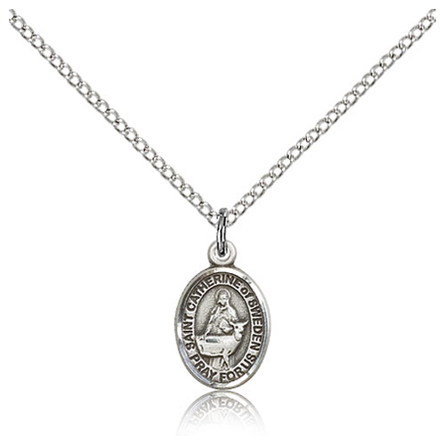 Die struck, hand-engraved Saint Cathering of Sweden charm. Free 18-inch sterling silver lite curb chain with lobster clasp. Plain back. Dimensions: 1/2in x 1/4in. This item is half the height of a quarter. Made in USA.
