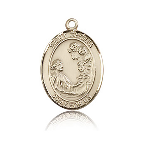 This oval St Cecilia medal is made of polished, solid 14kt yellow gold. Inscription: SAINT CECILIA PRAY FOR US. Item size: 3/4in x 1/2in. This item is the size of a penny. Die struck, hand-engraved medal. Made in USA.