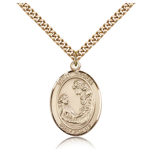 This oval gold filled St Cecilia medal dangles from a 24in gold-plated stainless steel curb chain with lobster clasp. Inscription: SAINT CECILIA PRAY FOR US. Dimensions: 1in x 3/4in. This item is the size of a quarter. Die struck, hand-engraved medal. Made in USA.