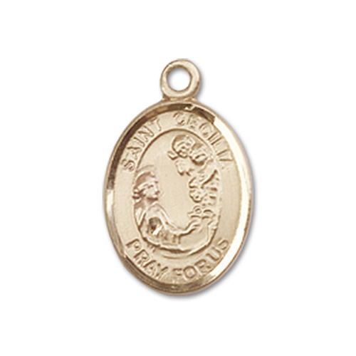 Die struck oval St Cecilia medal is made of polished 14kt yellow gold. Dimensions: 1/2in x 1/4in. This item is half the height of a quarter. Inscription: SAINT CECILIA PRAY FOR US. Made in USA.
