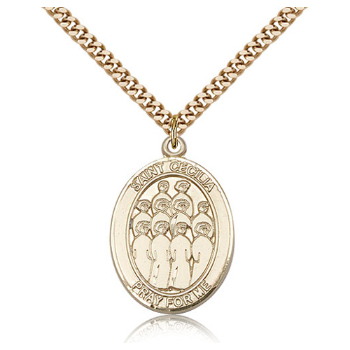 This St Cecilia choir medal is made of gold filled sterling silver and dangles from a 24-inch stainless steel, endless heavy curb chain with gold plating. Dimensions: 1in x 3/4in. This item is the size of a quarter. Inscription: SAINT CECILIA PRAY FOR US. Made in USA.